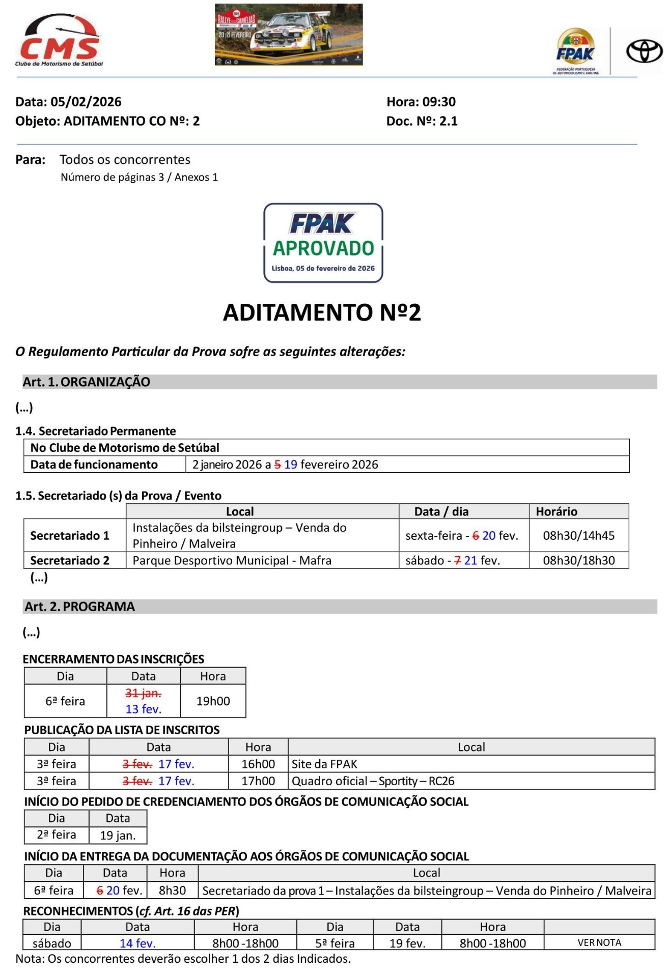 Inscrições no Portal da FPAK + Comunicado N.º 3 - Adiamento do Rali + Roadbook + Comunicado N.º 2 - Alteração de Data + Aditamento N.º 2 + Aditamento N.º 1 + Comunicado N.º 1 - Reconhecimentos + Regulamento Particular